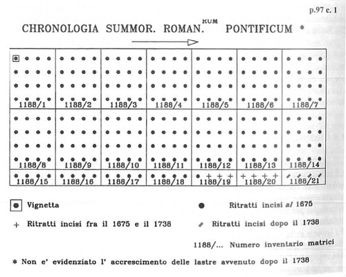 Nell’ambito della bottega De Rossi le prime ventidue matrici furono predisposte anteriormente al 1677: alcune risultano già incise con i ritratti dei papi sino a Innocenzo XI (1676-1689), mentre altre furono preparate soltanto con le cornici o forse già con i clipei, per essere poi periodicamente aggiornate con l’inserimento dei ritratti dei pontefici successivi sino a Clemente XII (cfr. Grelle, Indice, pp. 499-501, nota alla p. 97, c. 1). Le matrici con i ritratti dei pontefici sino a Clemente XII sono da identificare con quelle oggi inventariate con i numeri 1-20 nell’ambito della serie n. inv. 1188.